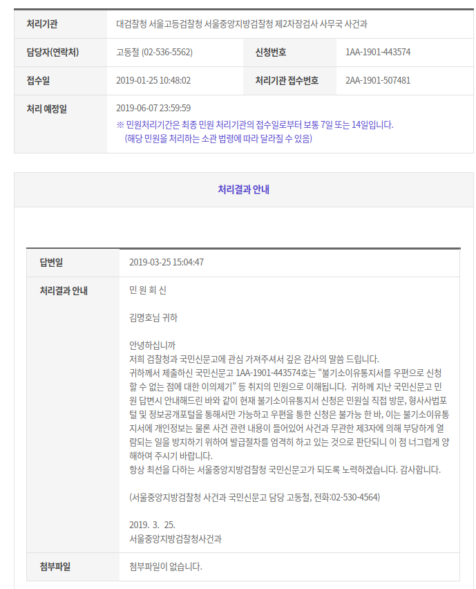 그랬더니 1.24일 서울중앙지검 직원 고동철이란 인간이 '불기소 이유 고지 청구를 우편으로 할 수 없다'는 위법 개소리. 그 개소리에 대하여