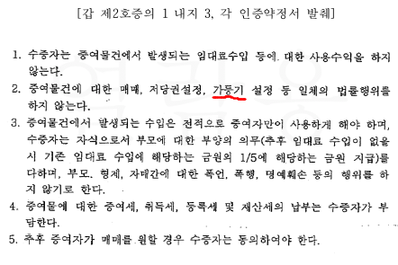 '홍봉유 소유 부동산을 수증함에 있어서 증여자 생존 시에는 하기 사항을들 할 수 없으며, 일항이라도 위반 시에는 증여물에 대한 증여를 취소하고 증여자에게 증여물을 환원하거나, 증여물을 환원시키지 못할 사유가 있을 시에는 증여물 가액과 증여물 반환에 따르는 일체의 비용에 해당하는 손해배상을 하기로 약정한다'를