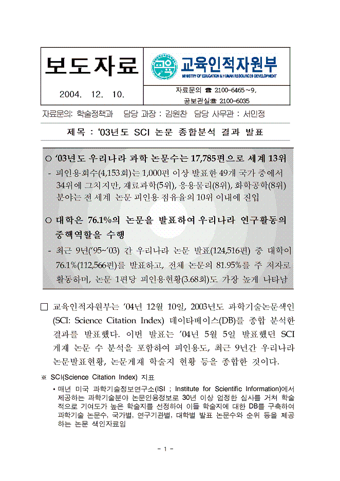 SCI 등록 논문에의 연구발표 권장은 비단 교육부 정책일 뿐만 아니라