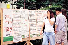 5월30일 기말고사가 시작된 동국대 교정은 비교적 조용했다. 그러나 본관 앞 마당에서는 거리전시회와 서명작업이 한창이다. 성폭력 사건의 가해자로 지목된 ㄱ교수가 2학기에도 수업을 배정받았다는 사실을 알고 학생들이 들고일어난 것이다. ㄱ교수는 2000년 7월 일본에 객원연구원으로 머물 때 동국대에서 자신의 수업을 들은 한 일본인 여성을 강제로 성추행한 의혹을 받고 있다. 2년 전에 일어나 이미 공론화된 사건에 대해 학생들이 ‘잊지 않고’ 시비를 거는 까닭은 무엇일까. 2년 동안 무슨 일이 있었던 것일까.