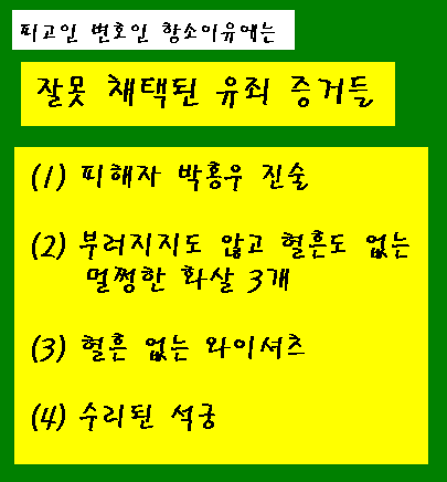 것이다. 그리고 화살에도 혈흔이 있어야 하는데, 발견되지 않았다. 이것도 유죄증거로 채택 됐는데 잘못이다. 다음에 피해자가 제출해서 압수한 증거