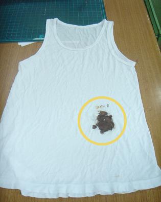 당시에 입고 있었던 옷 중에, 조끼까지는 피가 있는데 중간에 있었던 와이셔츠에는 피가 베어나오지 않고 않습니다. 공간을 통과해서 갑자기 조끼로 옮겨 붙은