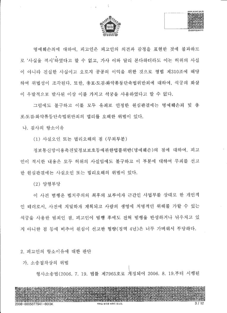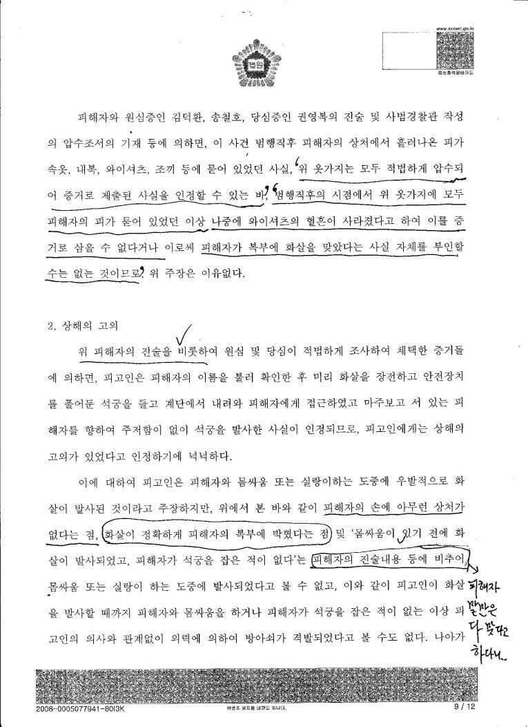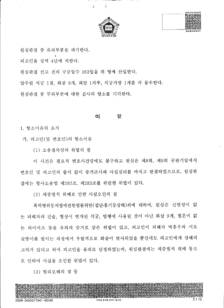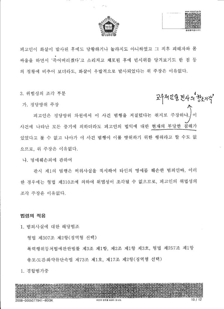 | 상해 및 증거 | 전치 5주(진단서와 갈비뼈 골절의 방사선 사진) | 전치 3주(증거없음, 자해 덮은 사진) |