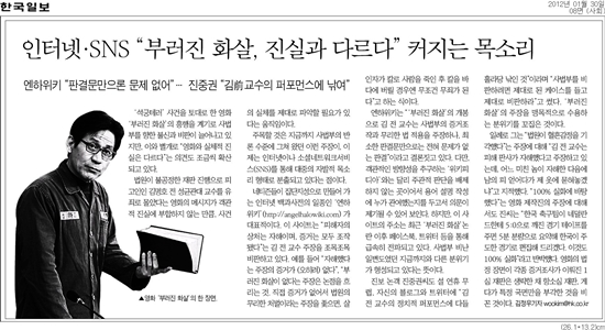 이를 두고 한국일보는 "인터넷ㆍSNS '부러진 화살, 진실과 다르다' 커지는 목소리"라고 제목이 달린 기사를 1월 30일치에 내었습니다. 부제로는 "엔하위키 '판결문만으론 문제 없어'… 진중권 '김前교수의 퍼포먼스에 낚여'"라고 달았습니다.