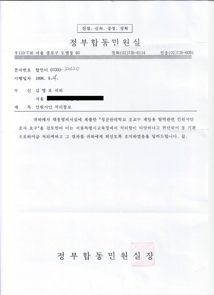 '(새로 전보온)청와대 민원실에서 성균관대학의 입시부정 및 위법한 해고행위에 대하여 니가 제출한 서류를 읽어 보았는데, 이게 사실이냐? 어떻게 이런 일이 생기냐? 증거가 확실한 이런 사건을 법원에서는 성대에게 뭐라고