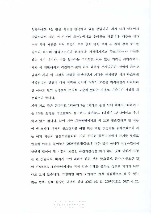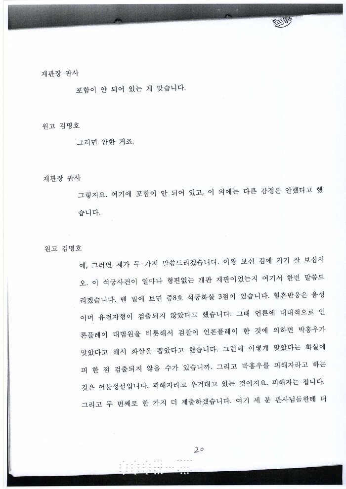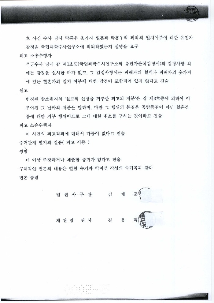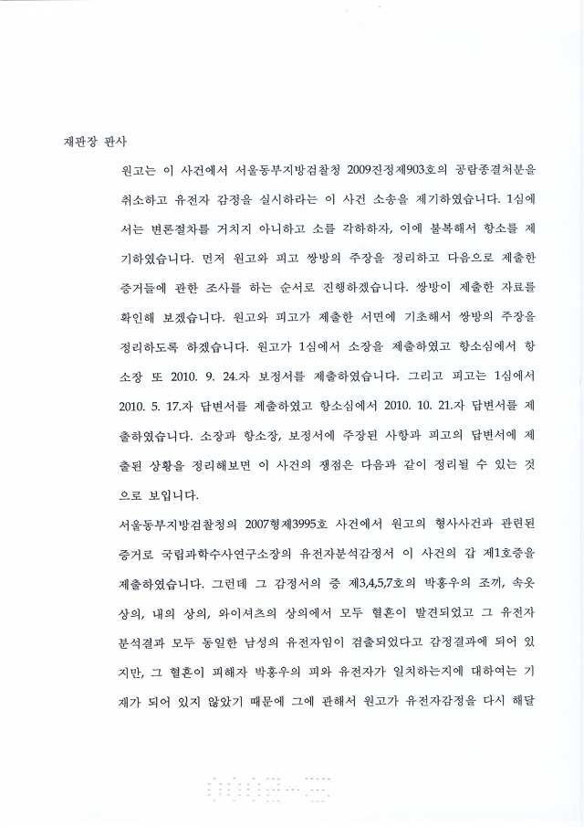박홍우 피가 아닌 제 3자의 피로 증거조작하였기에 박홍우 옷가지와 박홍우 피의 일치 여부에 대한 유전자 감정을 고의적으로 하지 아니하였다. 증거 조작한 검찰 놈들과(백재명, 조주태 검사) 혈흔 일치 여부 검증도 없이 증거채택하여 유죄 판결 내린 법원의 재판테러범들이(김용호, 이회기, 신태길, 이홍훈, 김홍도, 노정희, 김용덕 판사등의 쓰레기들 집단들) 혈흔 검증하지 않으려고 발버둥 치고 있다. |