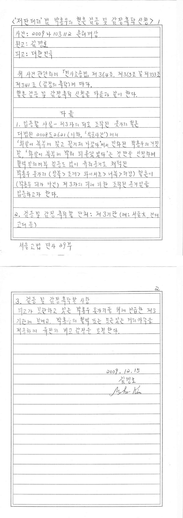 2009.12.18 원고 김명호 박홍우 옷가지 혈흔과 박홍우 피 일치 여부에 대한