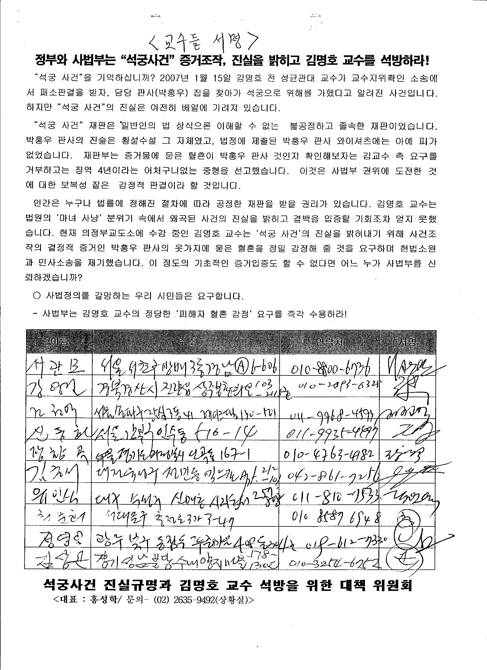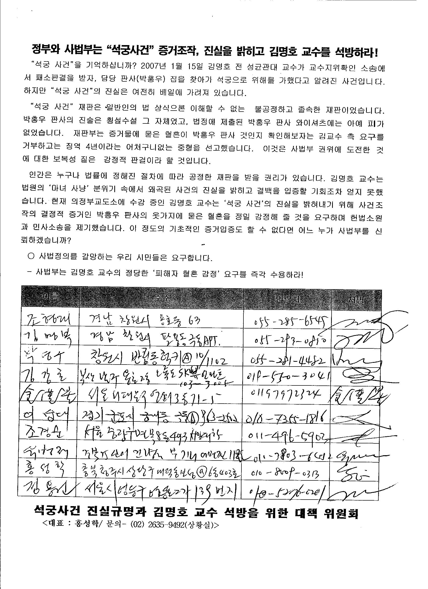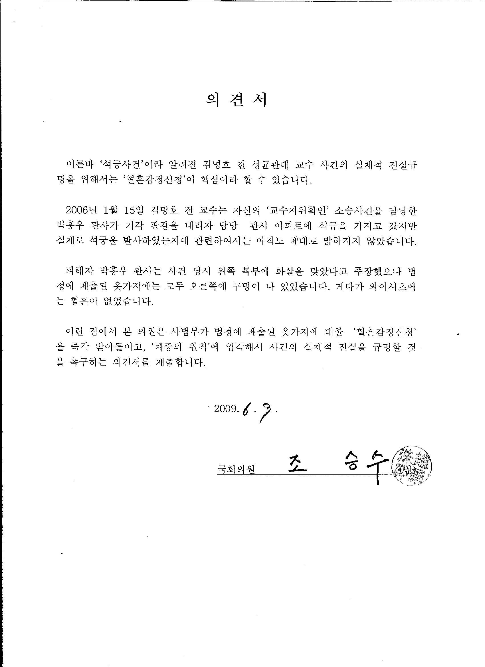 2009.06.16일 박홍우 옷가지 혈흔과 박홍우 피 일치 여부에 대한 혈흔 검증 촉구 의견 서명서를
