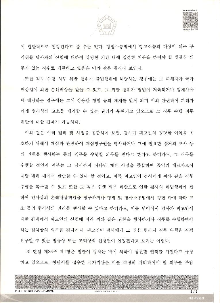 검사에게 혈흔 검사를 하라고 요구하는 행정처분 소송은 부적법하다"고 말했다.(* [헌법] 제12조 제1항에 규정된 '적법절차' 위반)