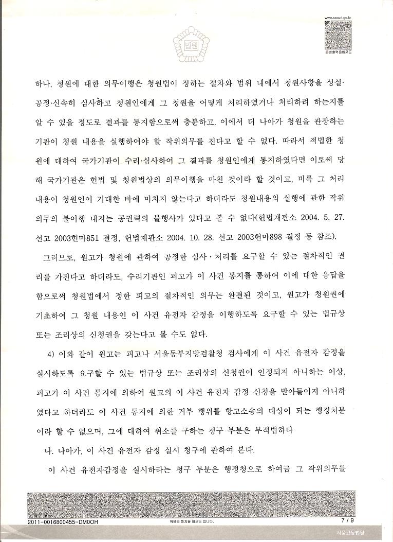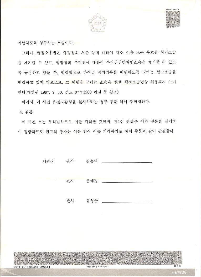 또는 조리상 신청권이 인정된다고 보기 어렵다"며 "김명호씨가 유전자 감성을 실시하도록 요구할 수 있는 신청권이 없는 이상