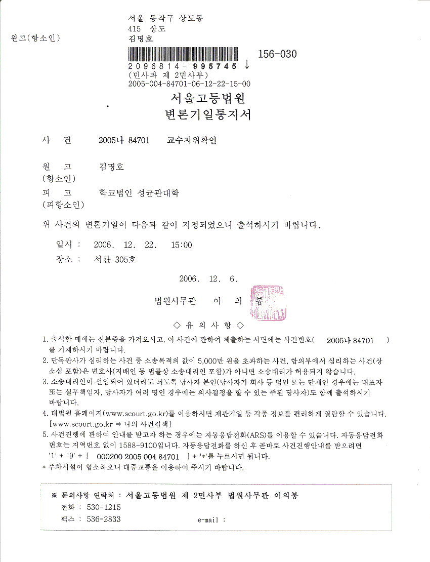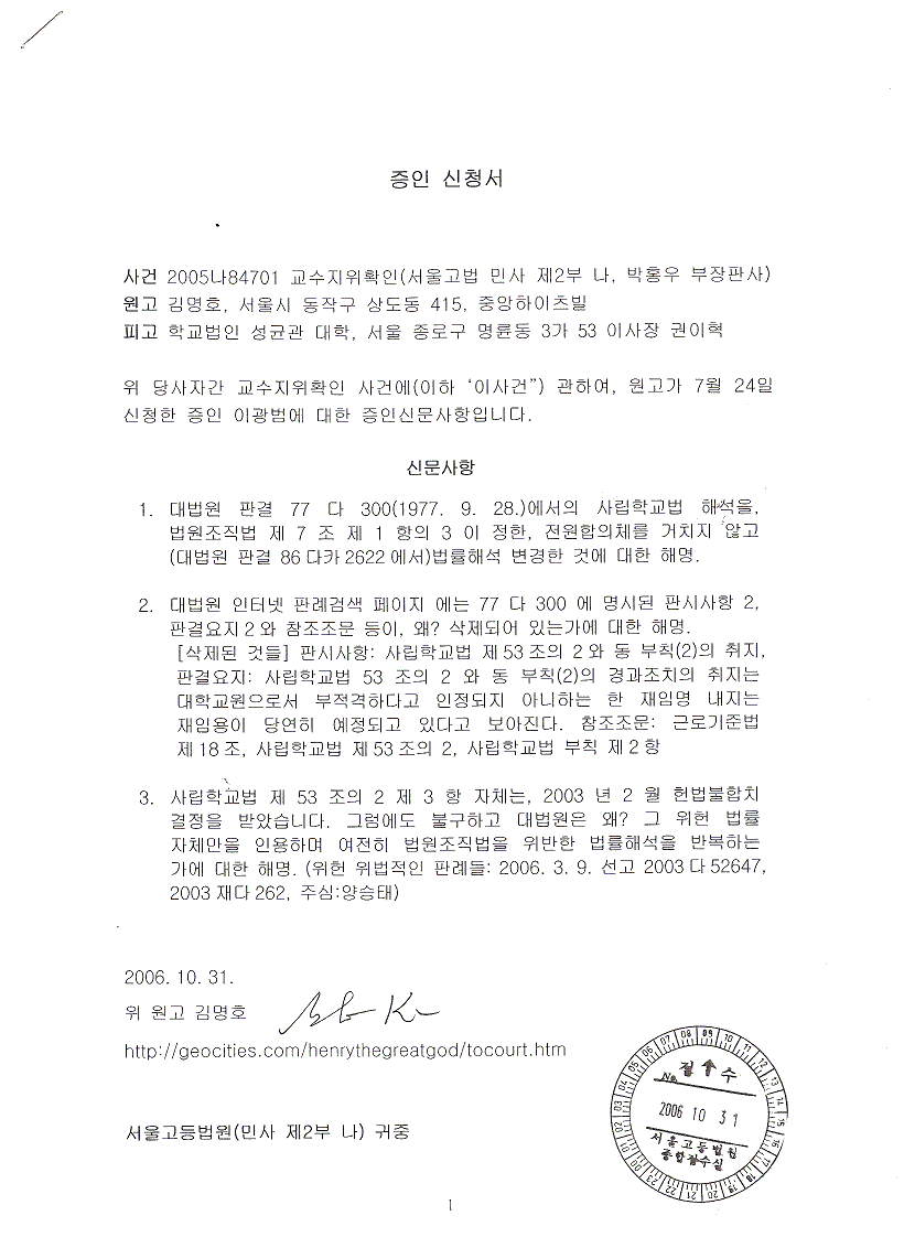 서울 중앙지방법원에 교수지위확인 소송 제기